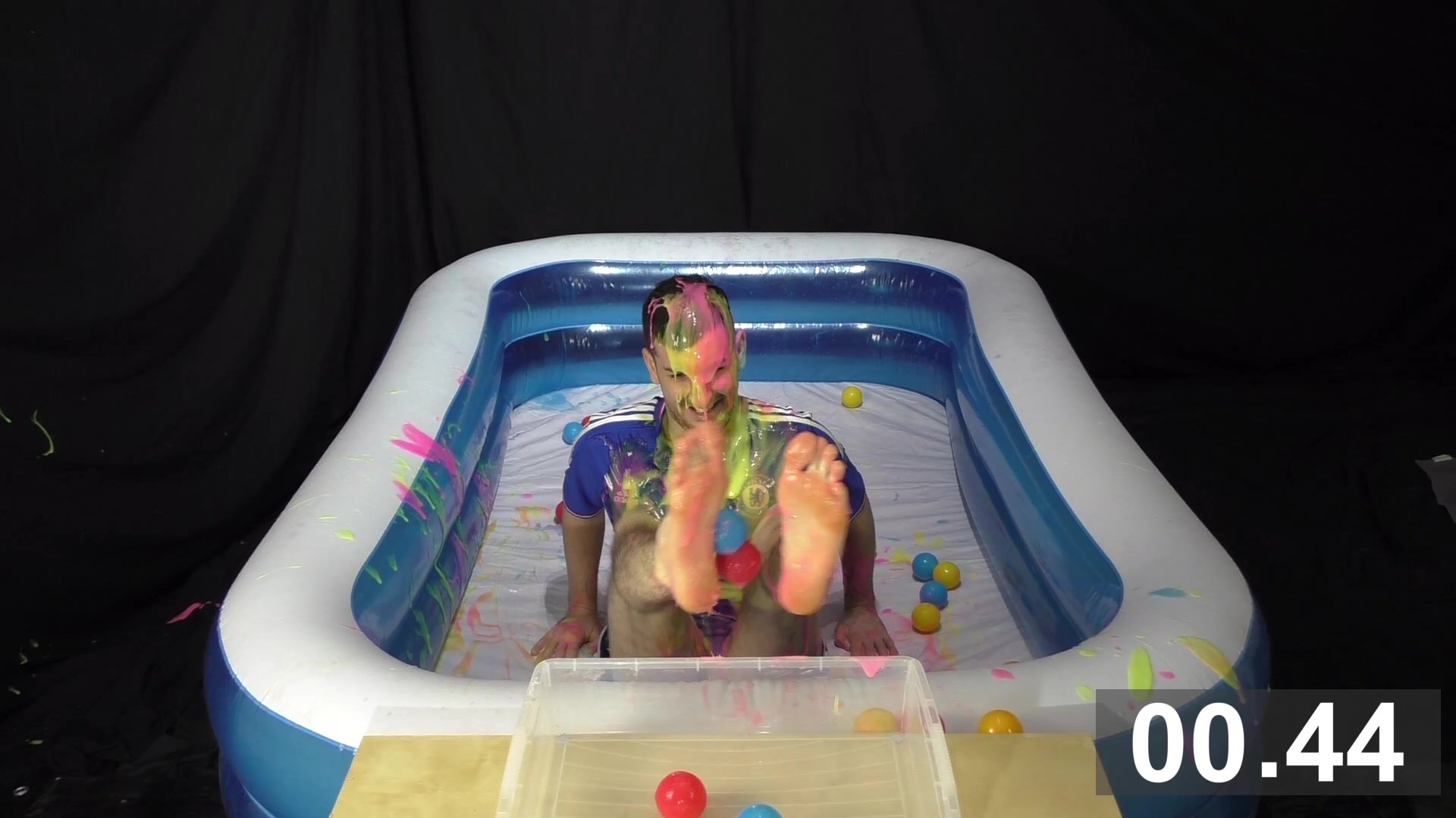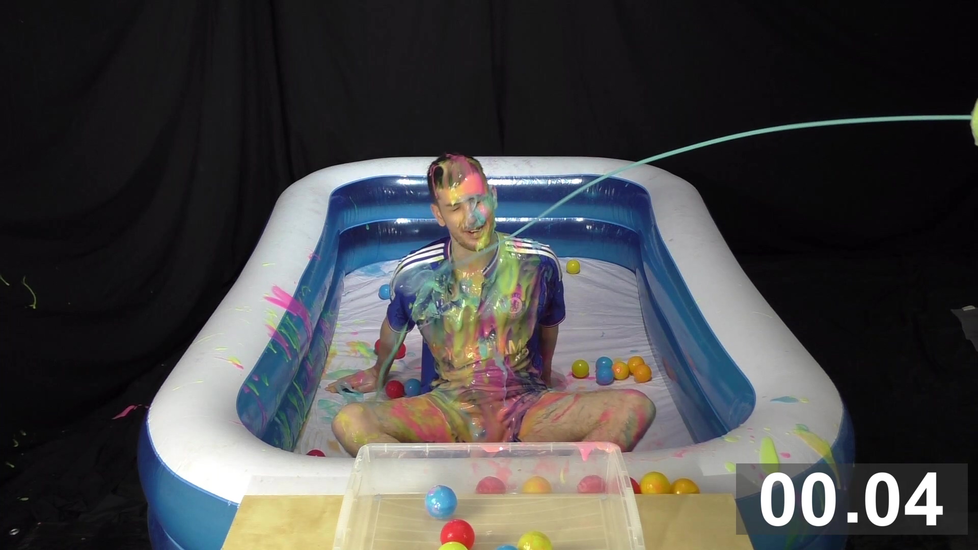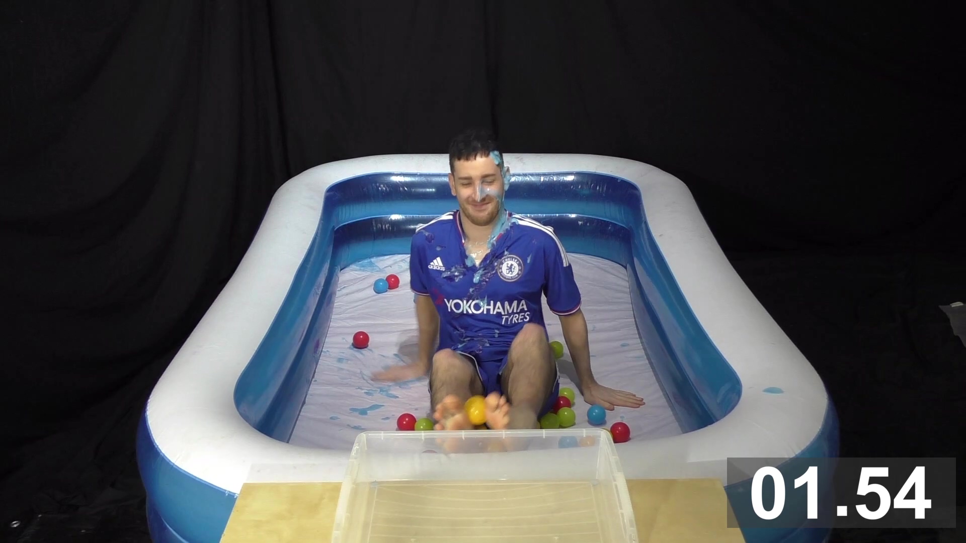Wearing a blue Chelsea football kit, SilverMillennium has 2 minutes to collect as many balls as he can using only his feet. He’s squirted with bright coloured gunge to slow him down.