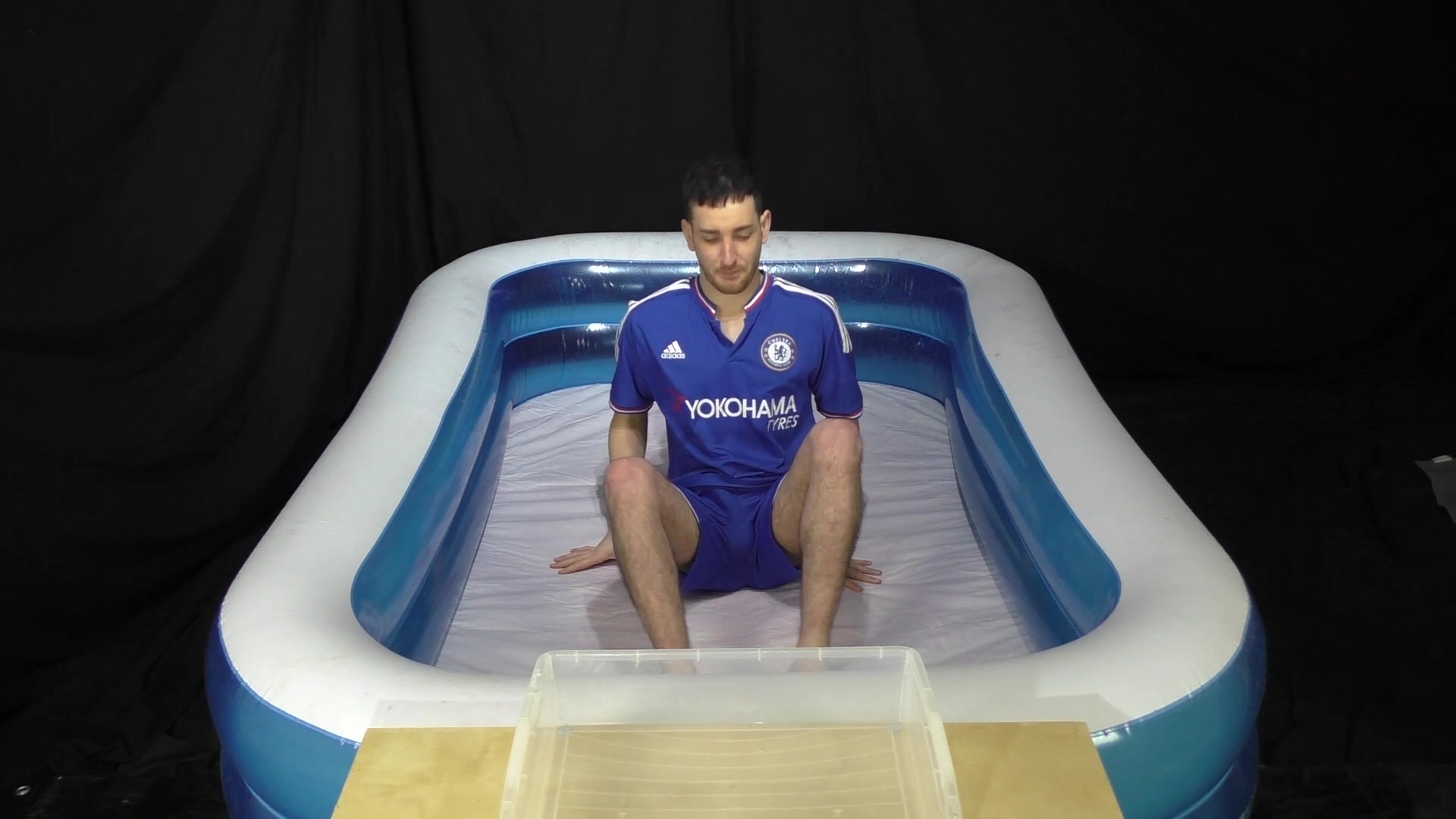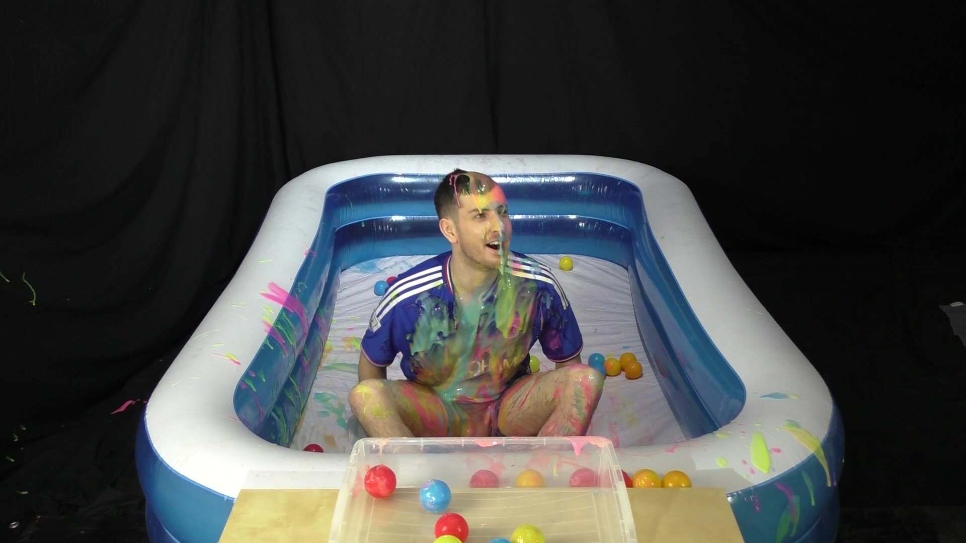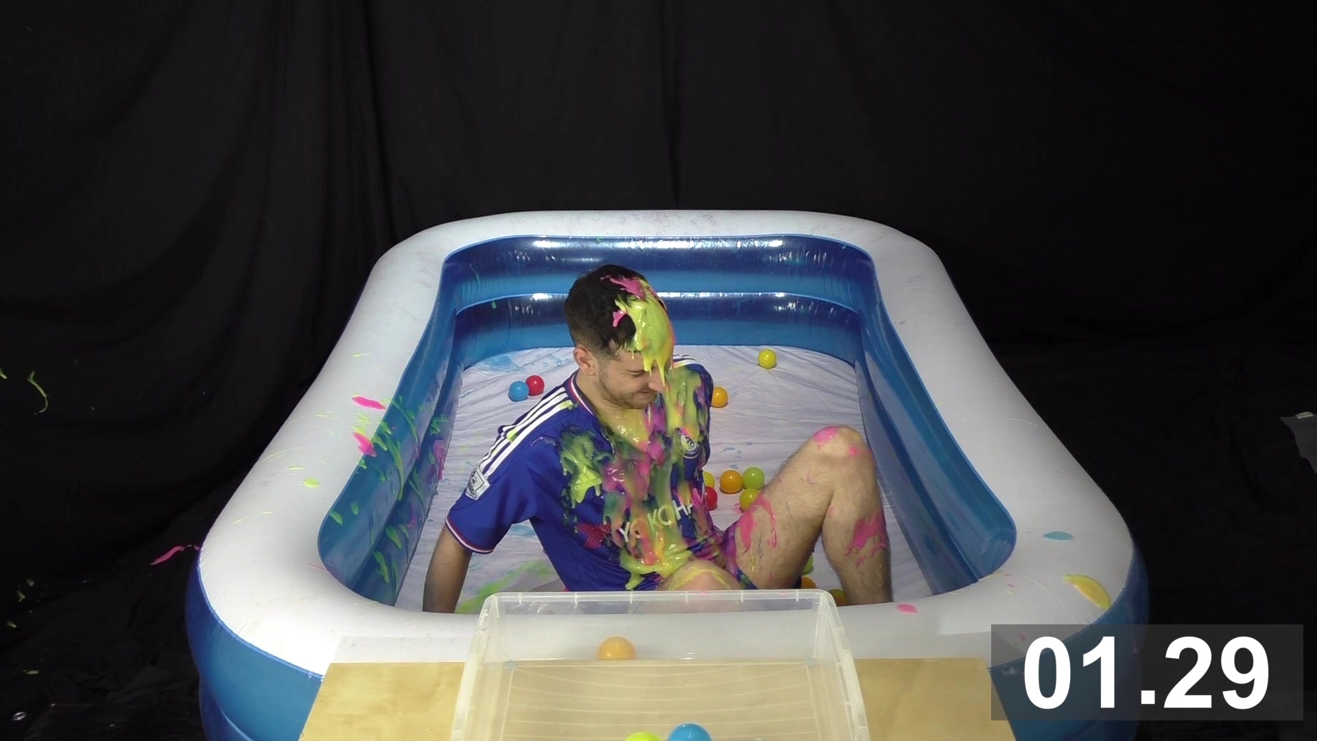 Wearing a blue Chelsea football kit, SilverMillennium has 2 minutes to collect as many balls as he can using only his feet. He’s squirted with bright coloured gunge to slow him down.