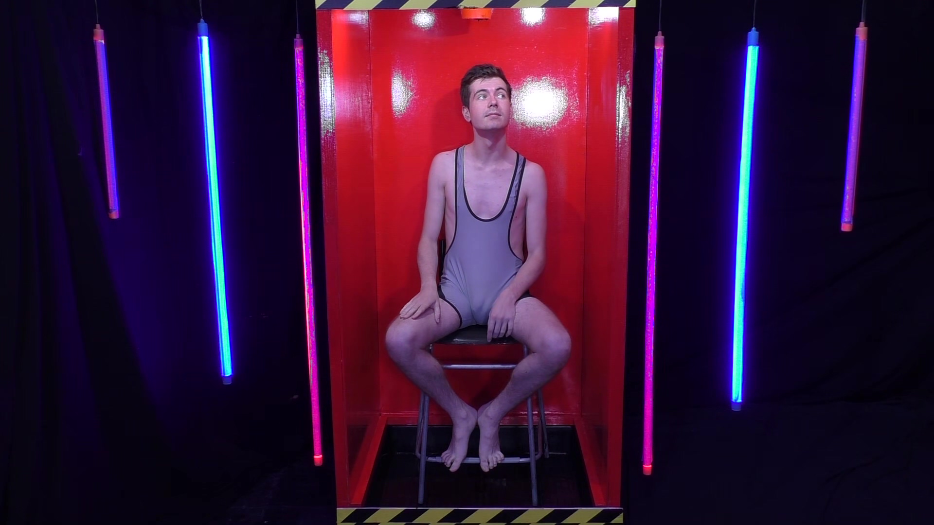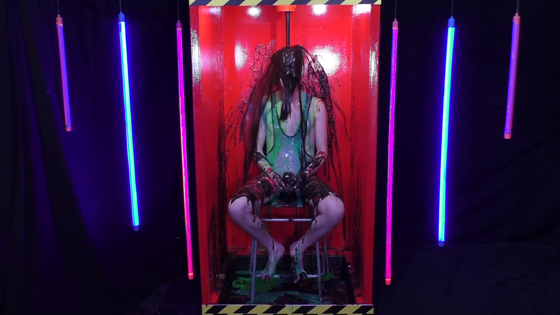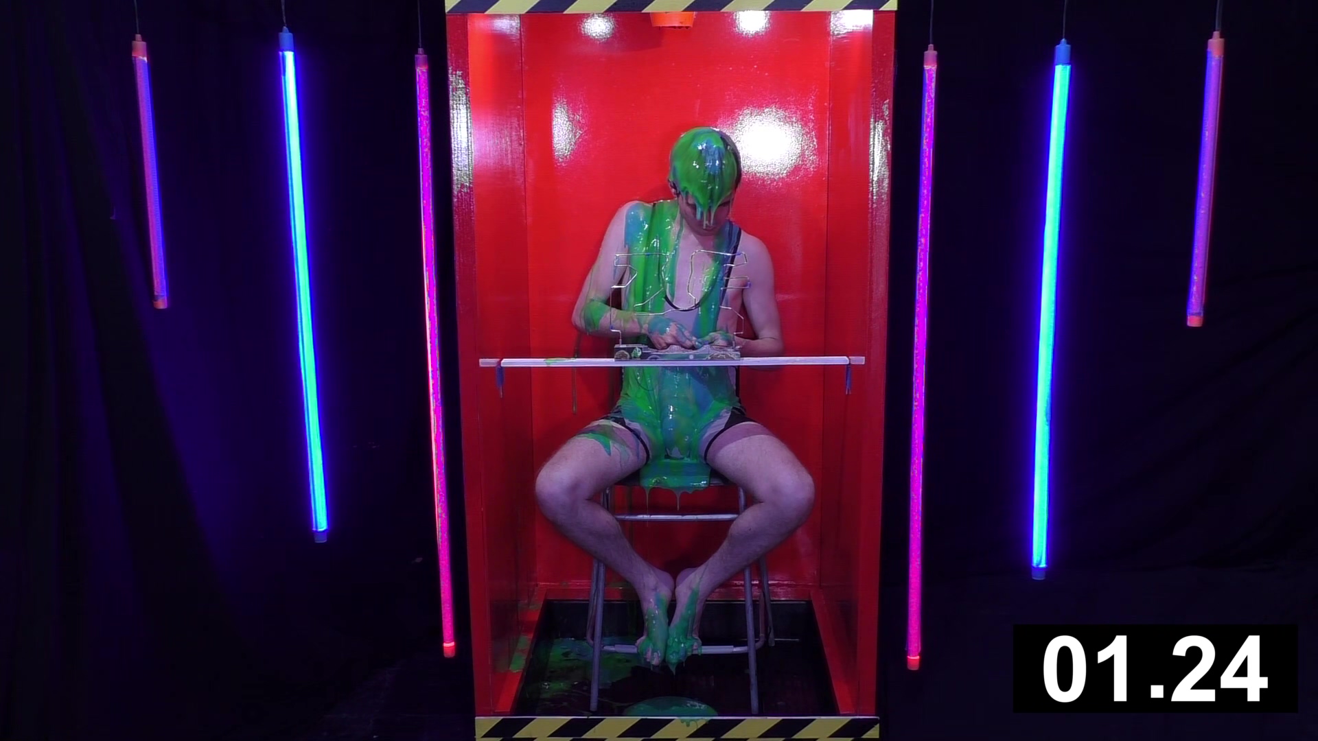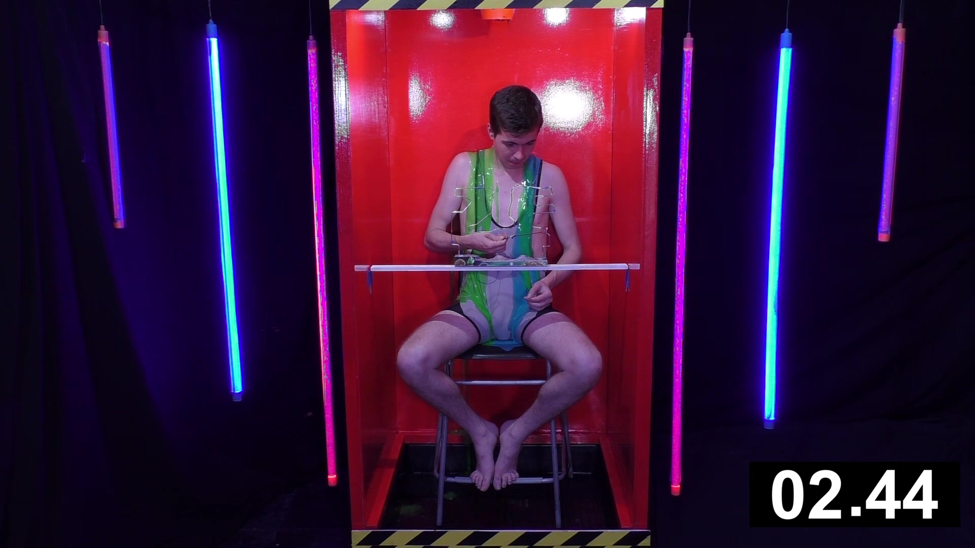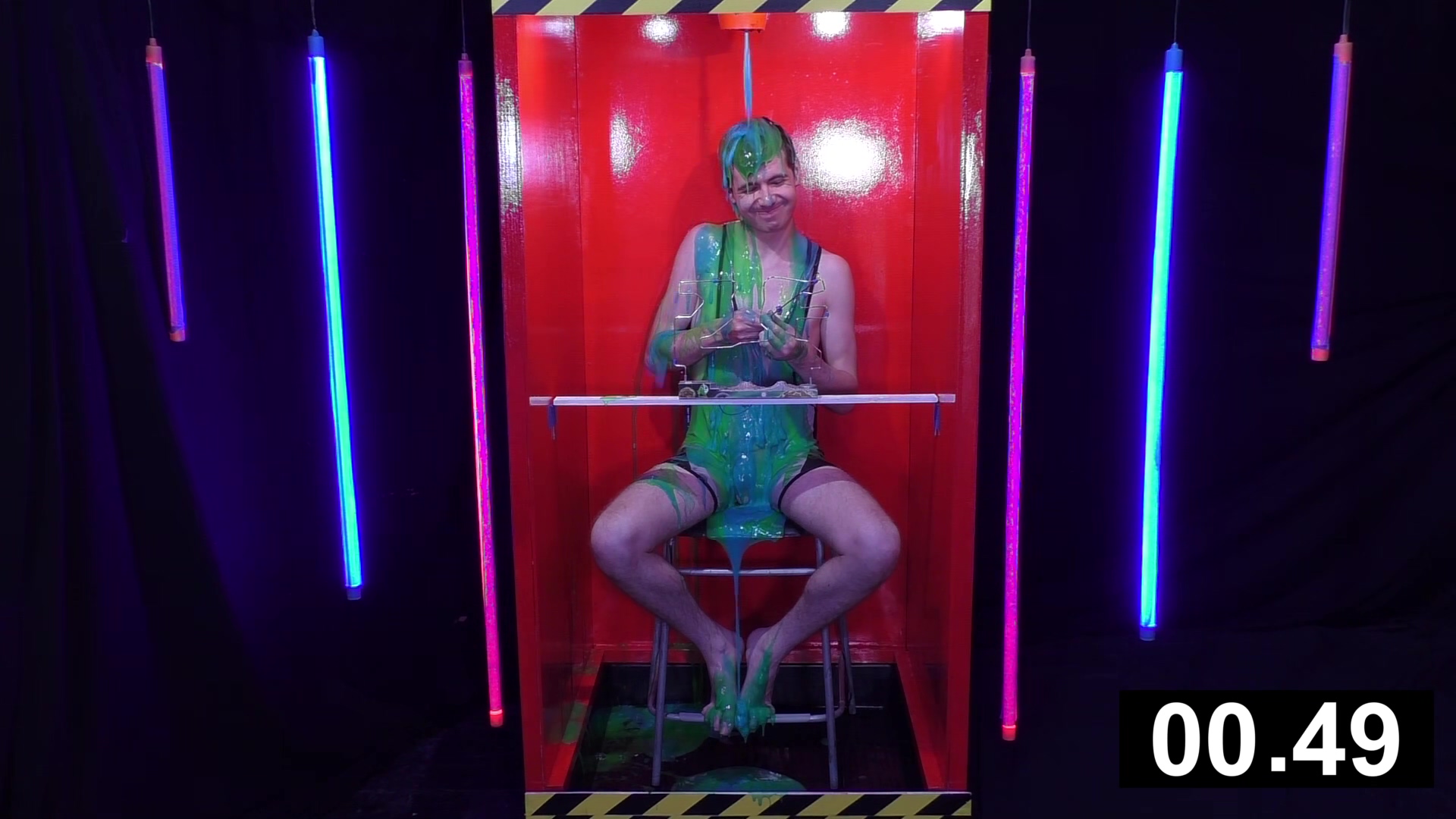 Stepping in to our very red tank wearing a not white anymore due to a washing incident Aussiebum wrestling singlet, it’s Ewan. He has 4 minutes to complete the buzz wire game. Each time he sets it off, he gets gunged and has to return to the start. At the end of the game when he runs out of time, he faces a dumping of thick black gunge.