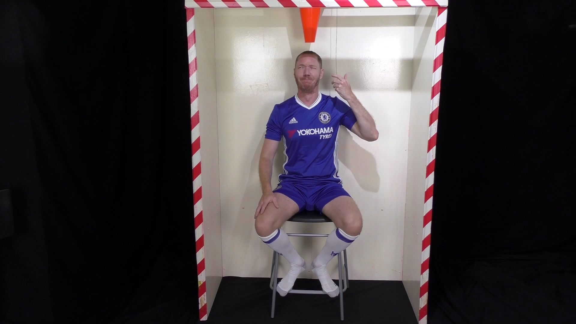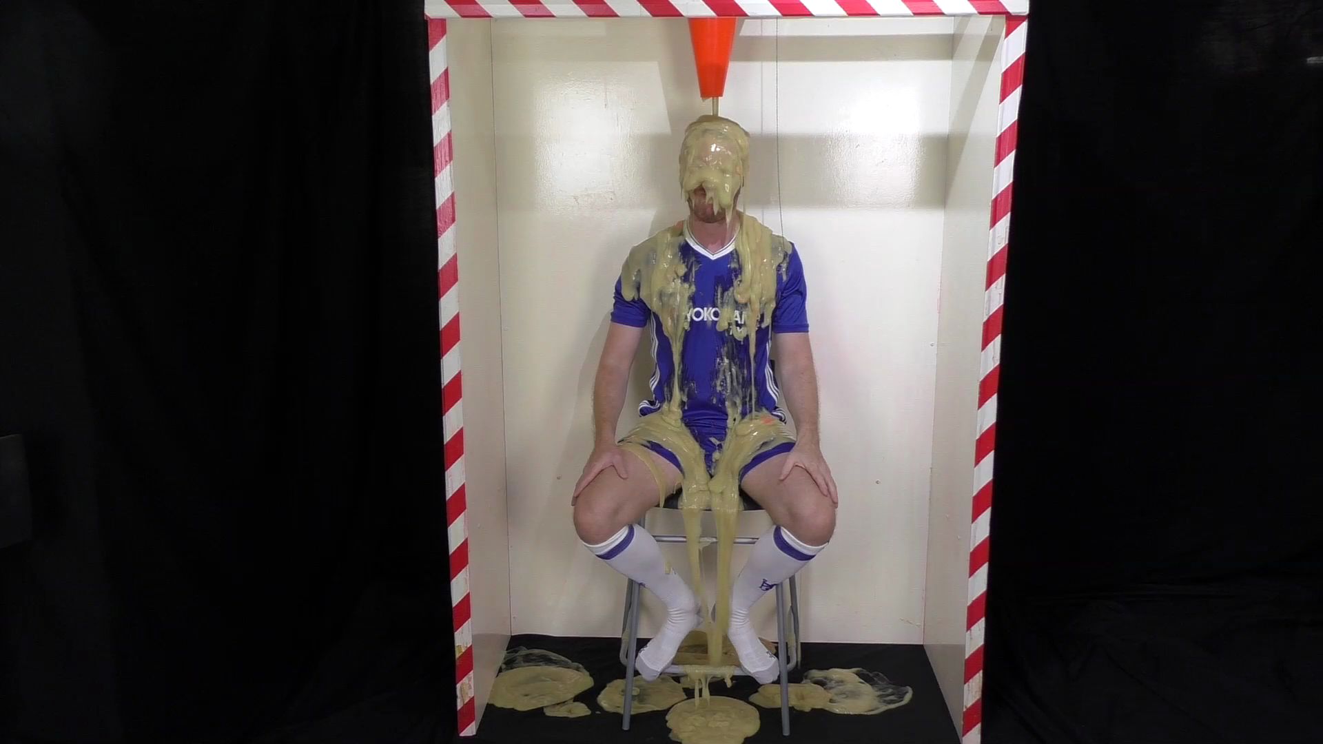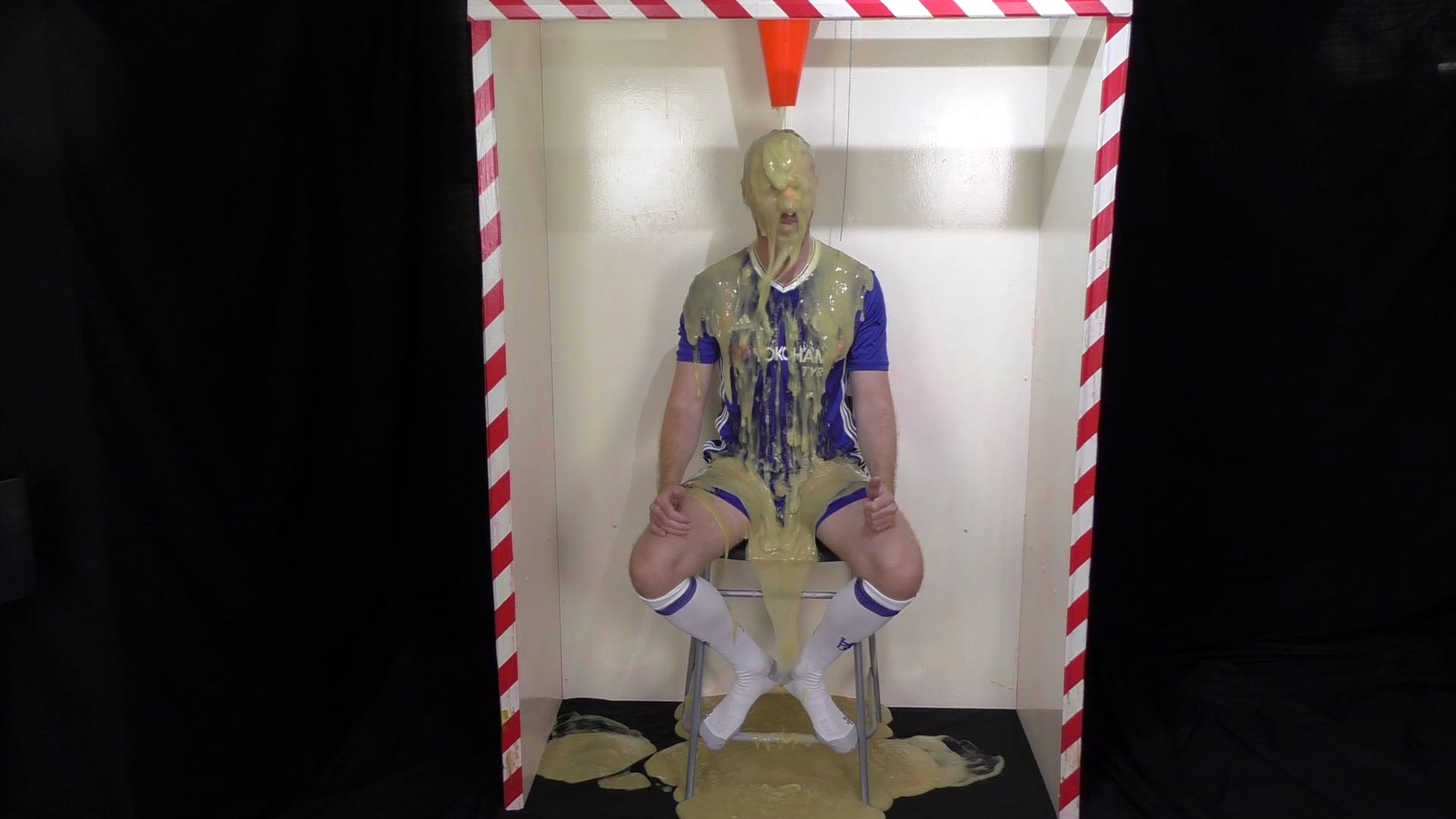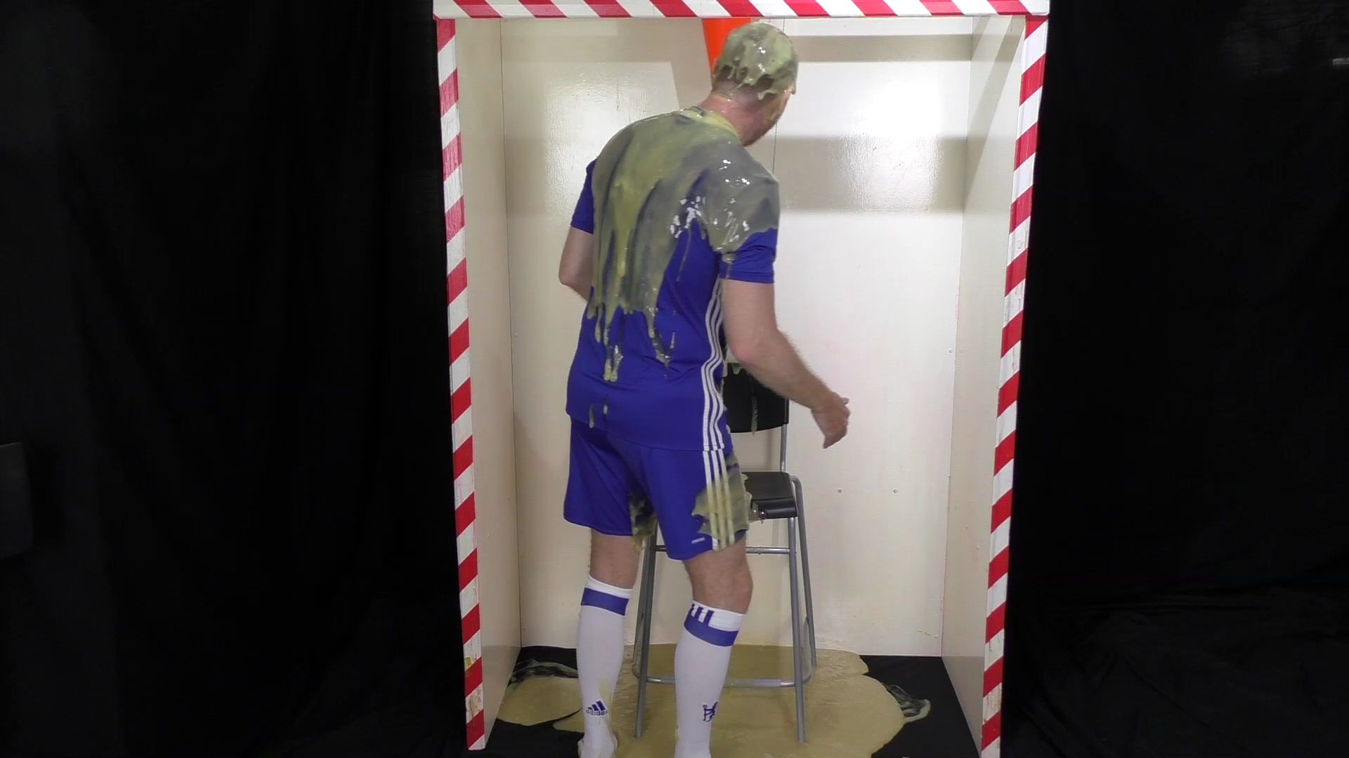 After a vote on Twitter, it was decided that MattUK would wear the Chelsea Football Club kit in to the gunge tank. Awaiting him is cold, thick green slime left over from the weekend before. There’s a little bit of post gunge footage just so you can see a bit more of the gunged kit.