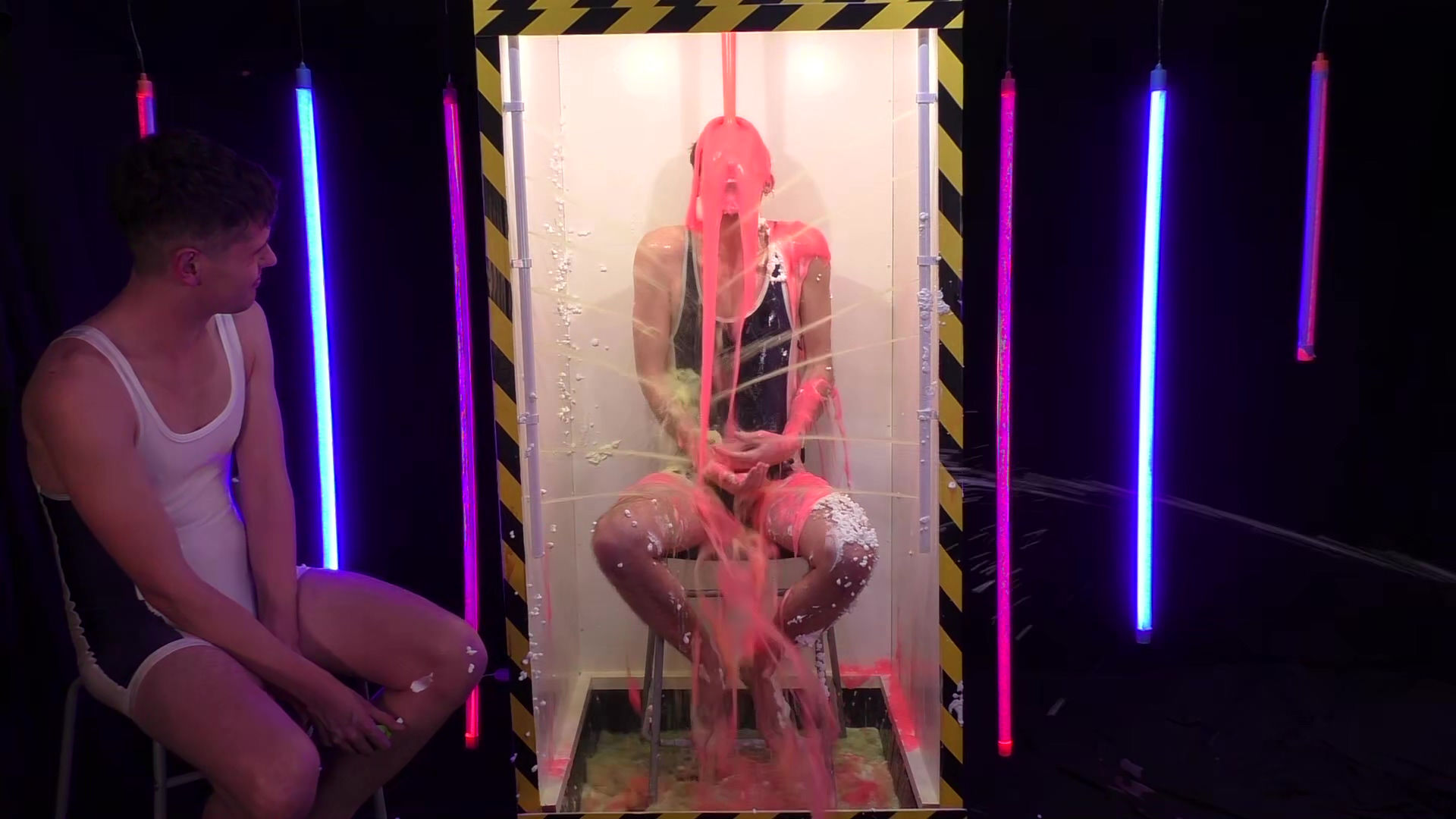 Adam loses the Rock, Paper, Scissor against Sebastian and is hand cuffed in to the tank. He has 2 minutes to unlock the 3 locks to escape the tank. To distract him further he is squirted with foam. He runs out of time so the side squirters are powered up and pink gunge is dumped on him from above.