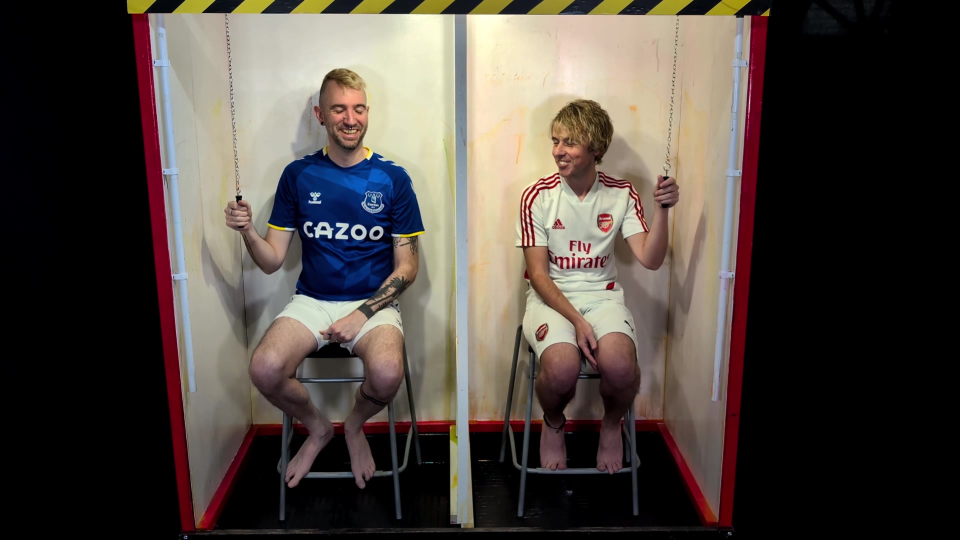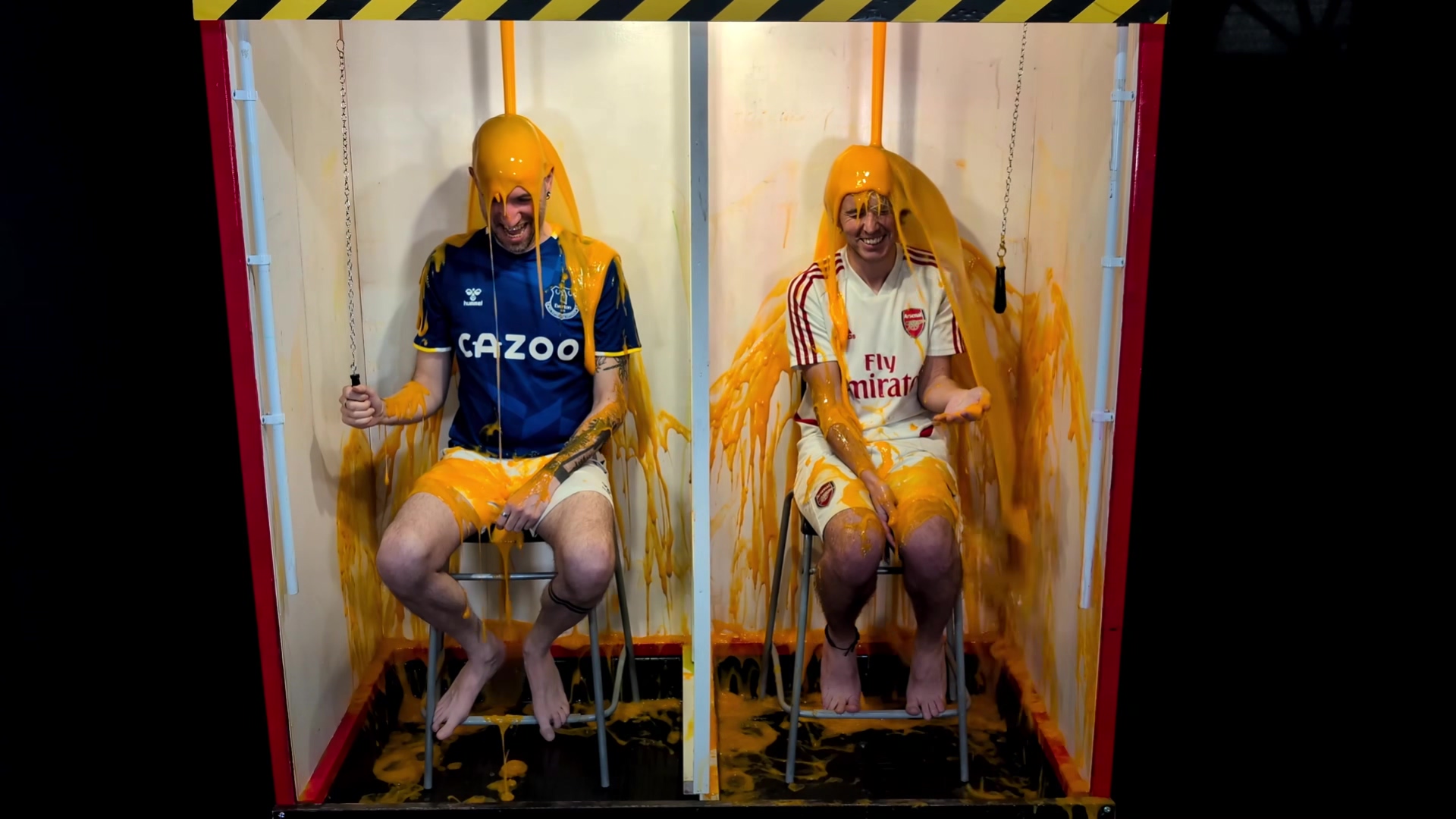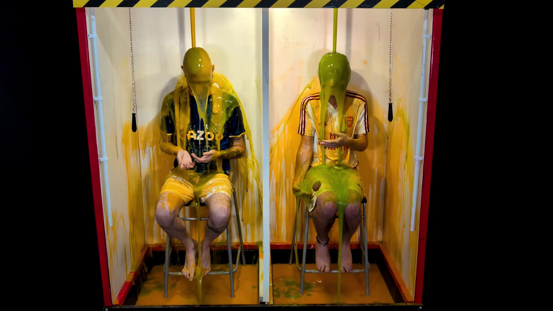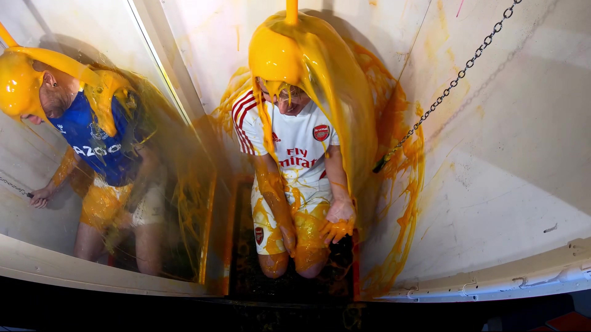 Wearing football kits, Marc and Jackson have to guess the combined price of 3 items from the shopping trolly. They can be pounds under, but not a penny over. The closest to the correct price, while not breaking the limit, wins. The other is gunged. If both players are over, then both get gunged. The bright orange gunge flows over both in round 1, taking them by surprise when they pull their release chains.