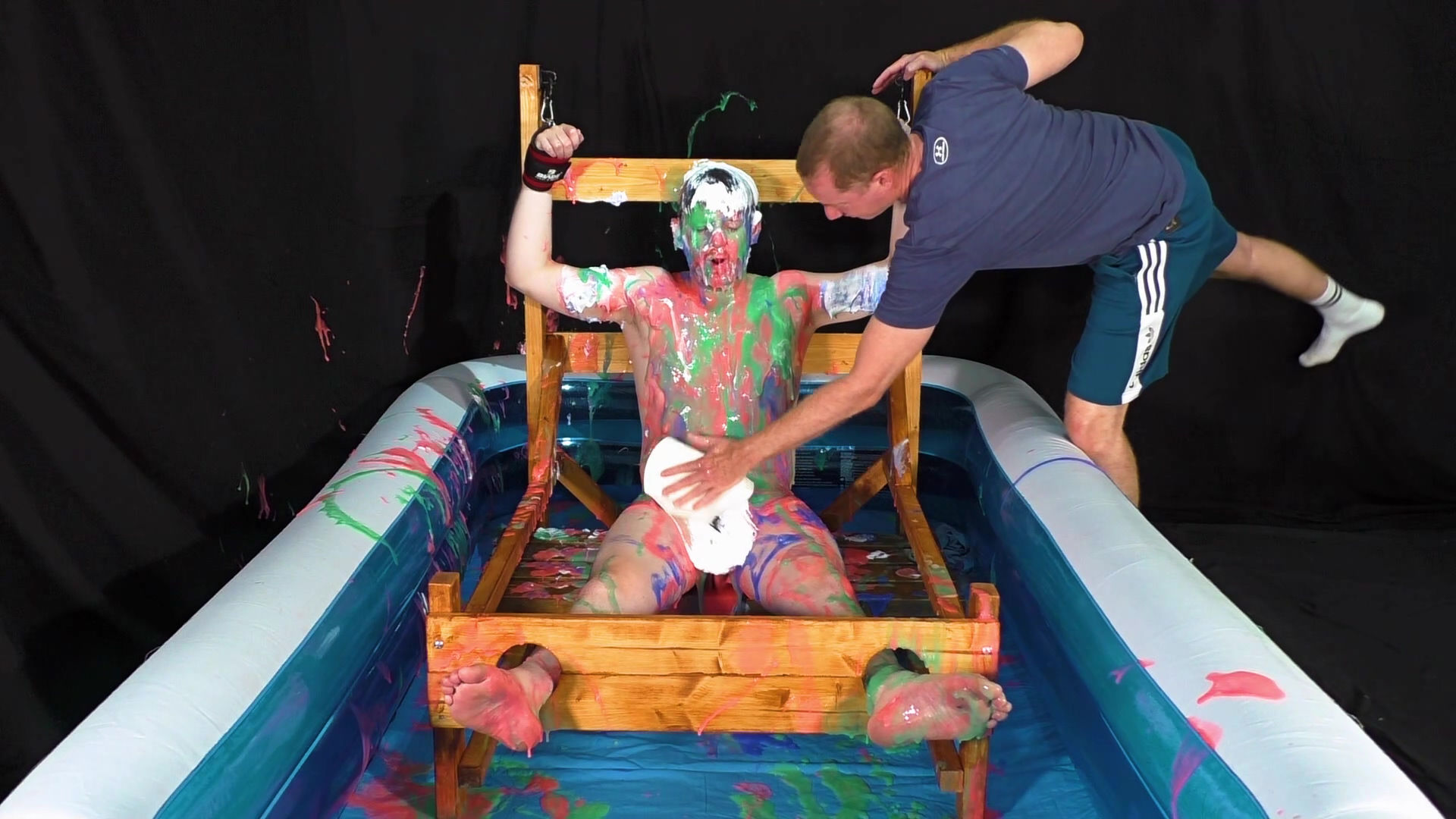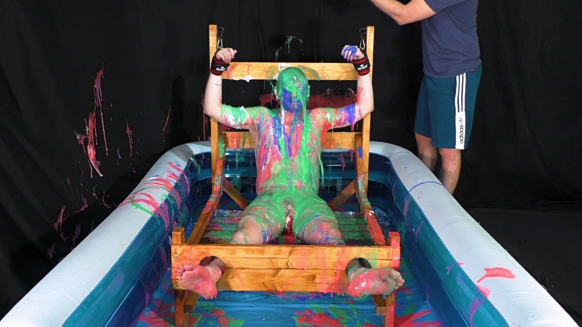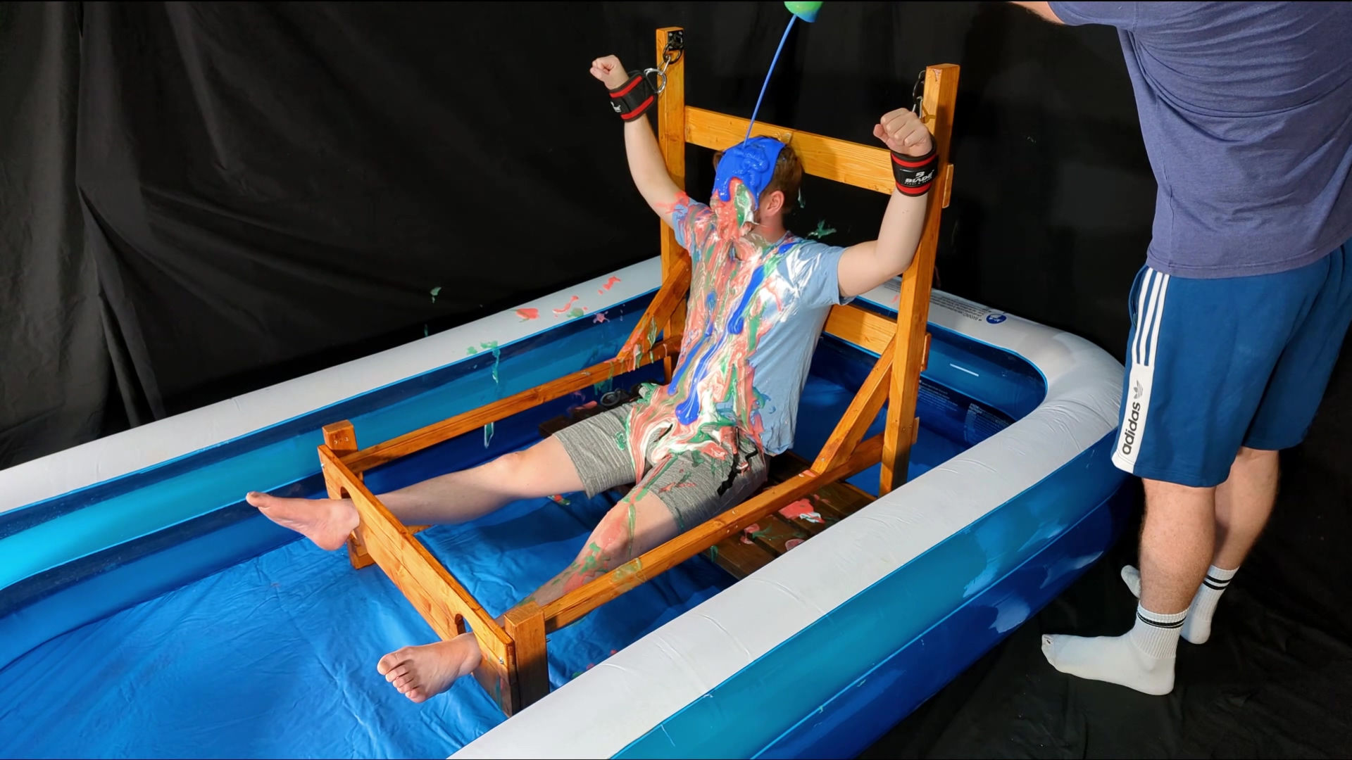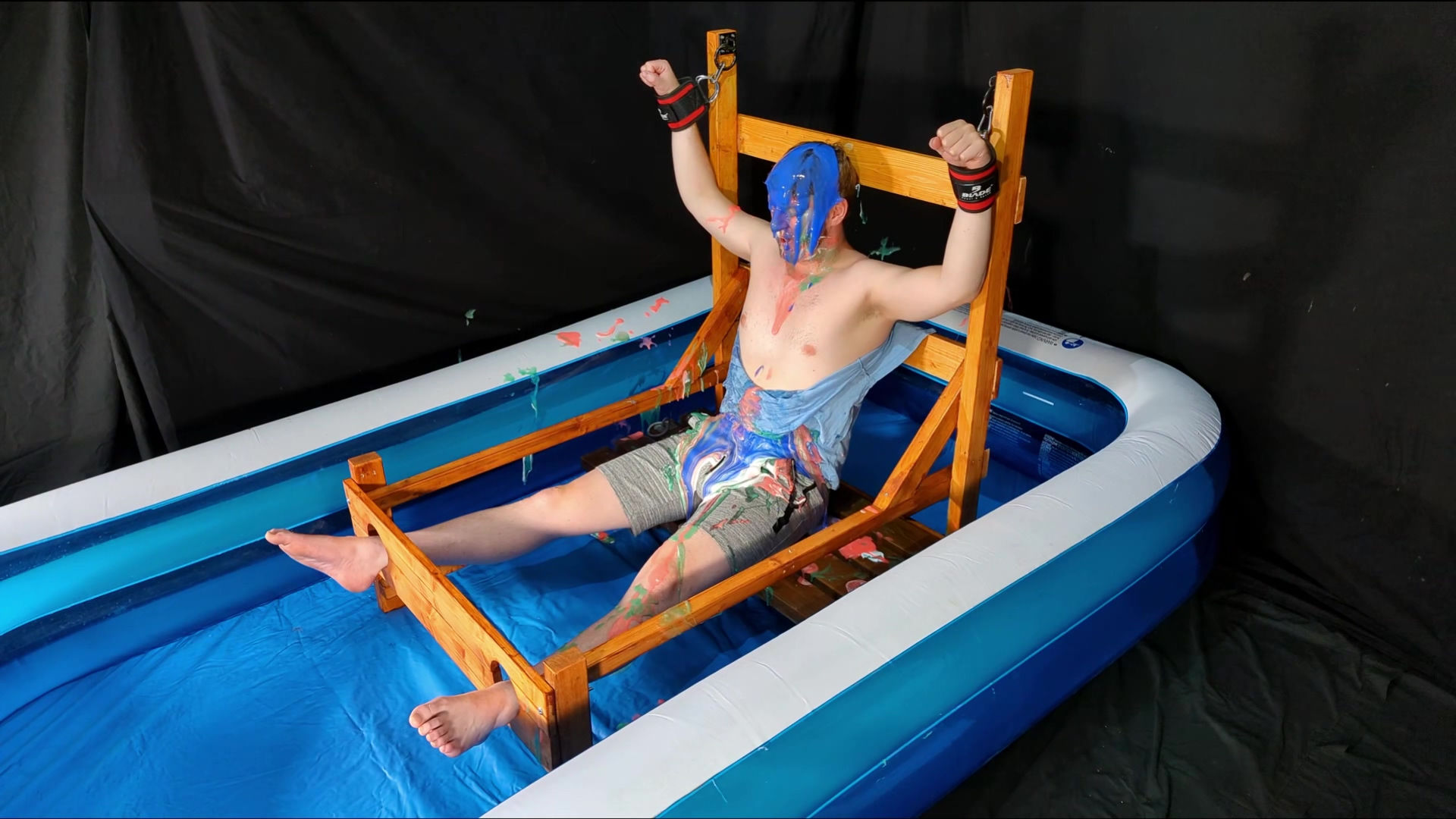 This time around it’s GungeABC who’s secured in to the stocks and then just basically gunged for our entertainment. His blue t-shirt is cut off and then his shorts are cut and ripped off leaving him in only a pair of green aussiebum briefs. A nicely placed hole at the front of the briefs becomes an ideal location for unloading the gunge gun and uou can see his bulge grow as they fill with gunge.