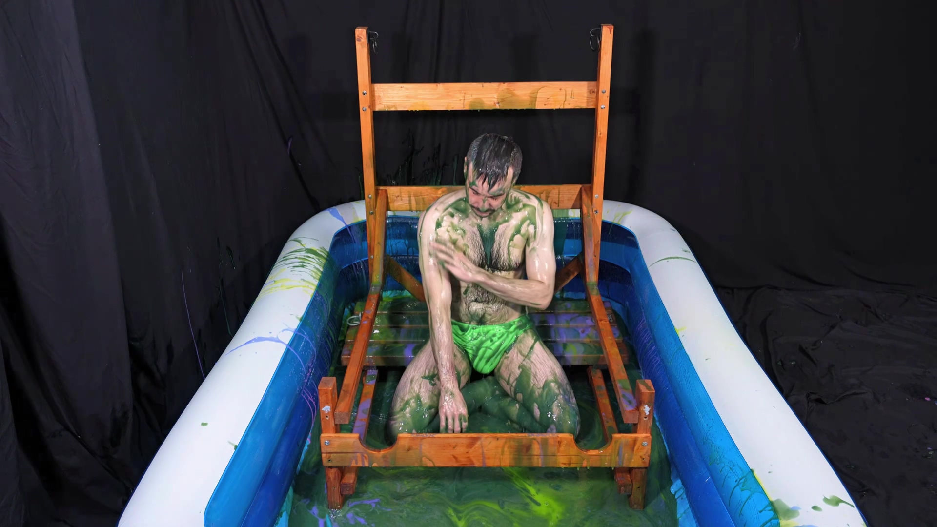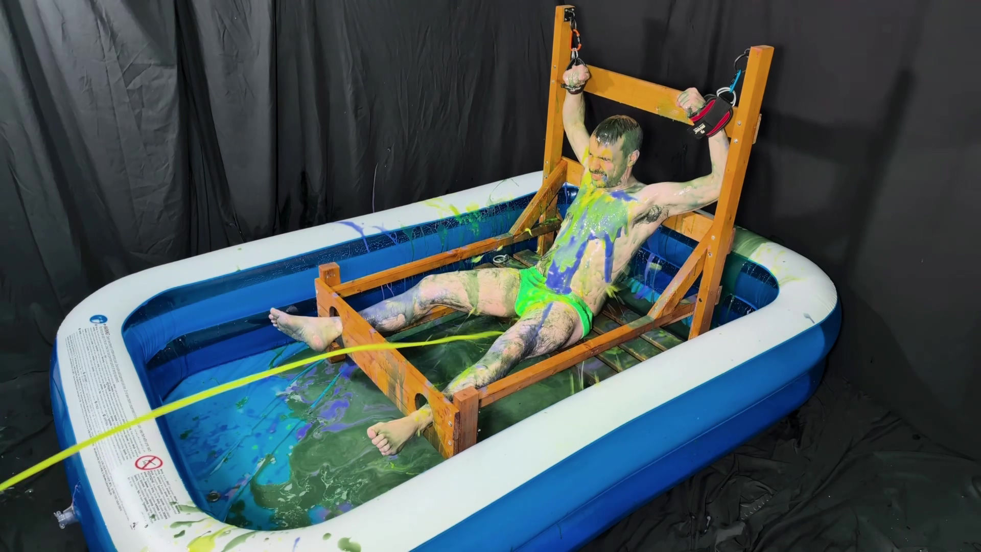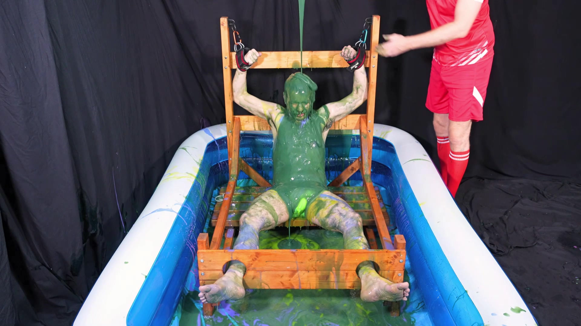 CInlay4Details gets back in to the stocks following on from his previous gunging. This time he’s down to only a pair of Speedos. He’s squirted with the gunge gun and has mucky green goo poured over him.