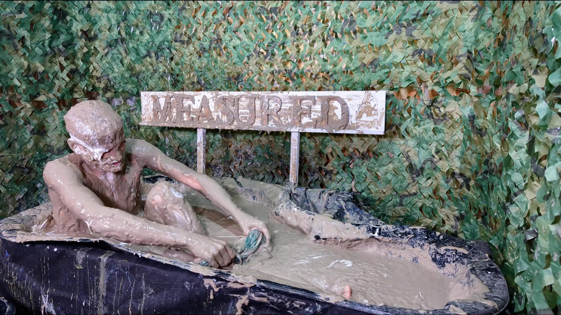 Adam wears a green Elite wrestling singlet and has an 8 letter word to guess since he got 3 pies in the first round. He struggles to guess the word, so in he’s given an easier clue, but he has to take off his wrestling singlet to earn that clue. Once he guesses the word he wallows in the mud and puts the singlet back on.