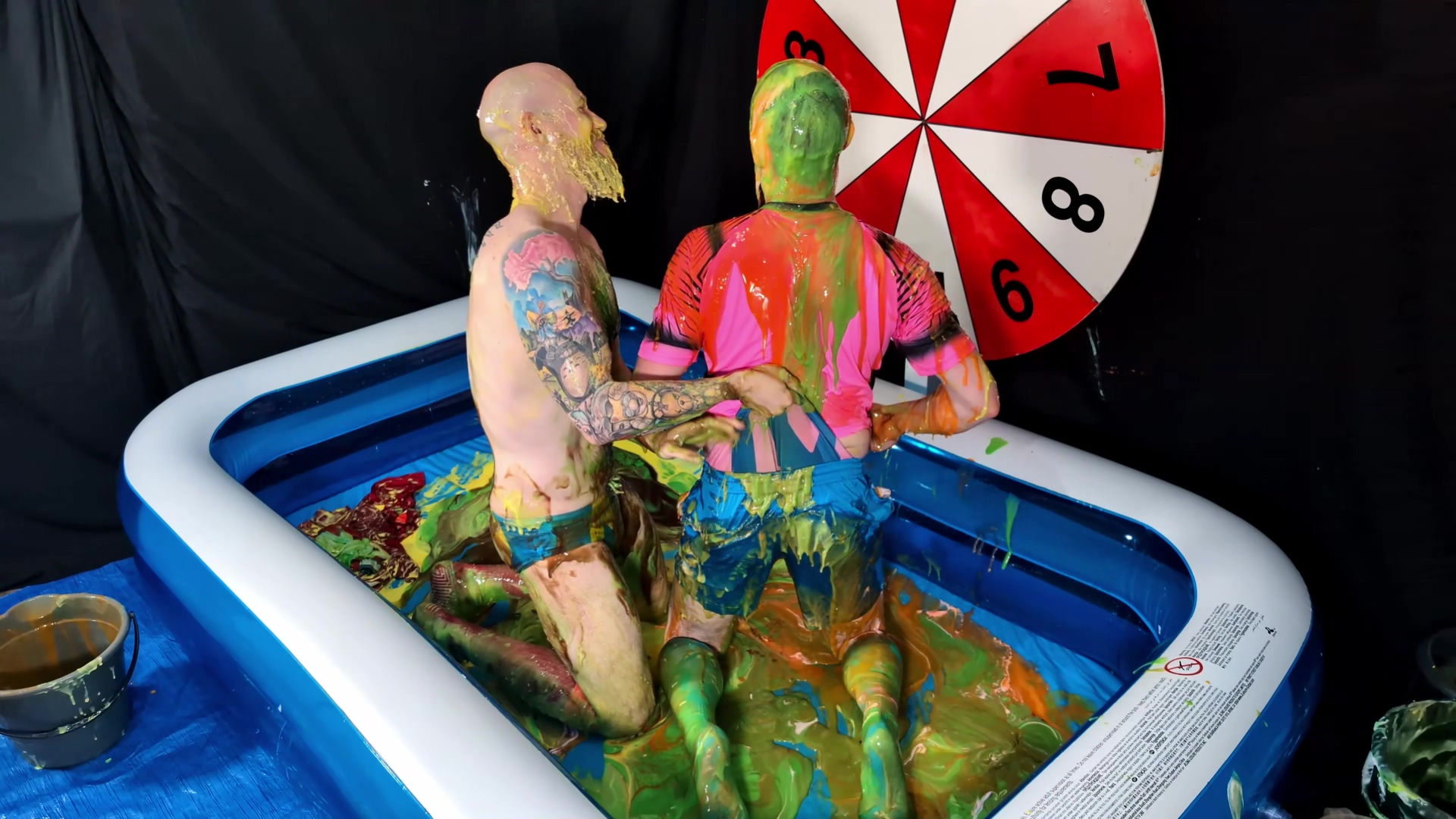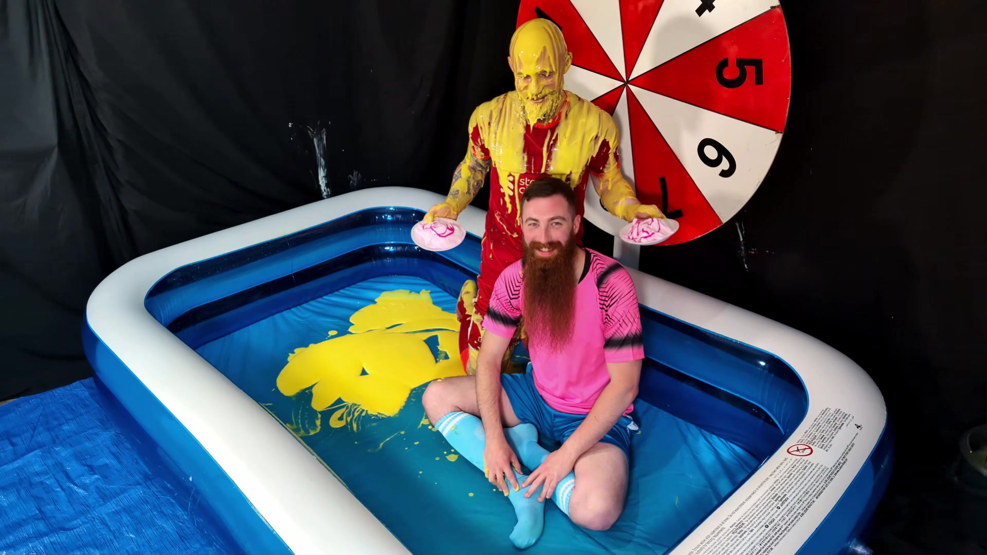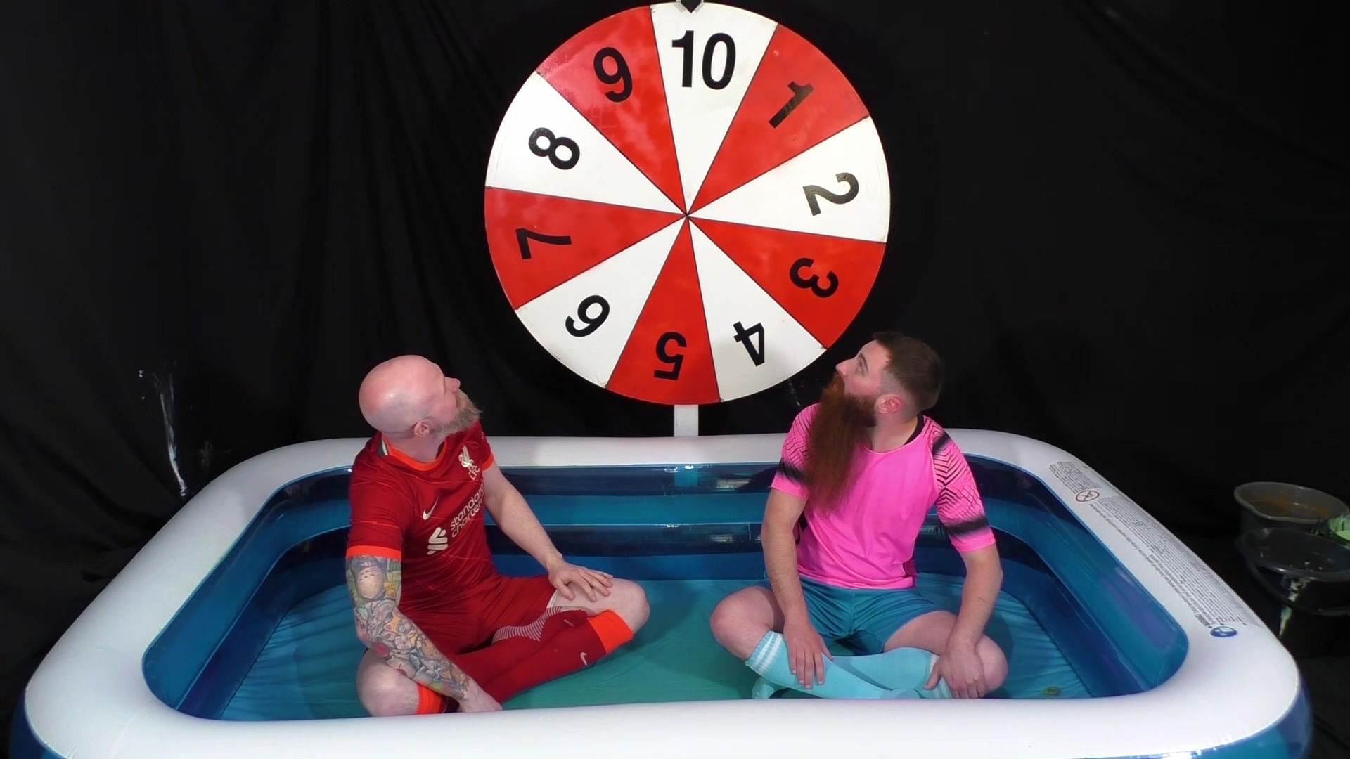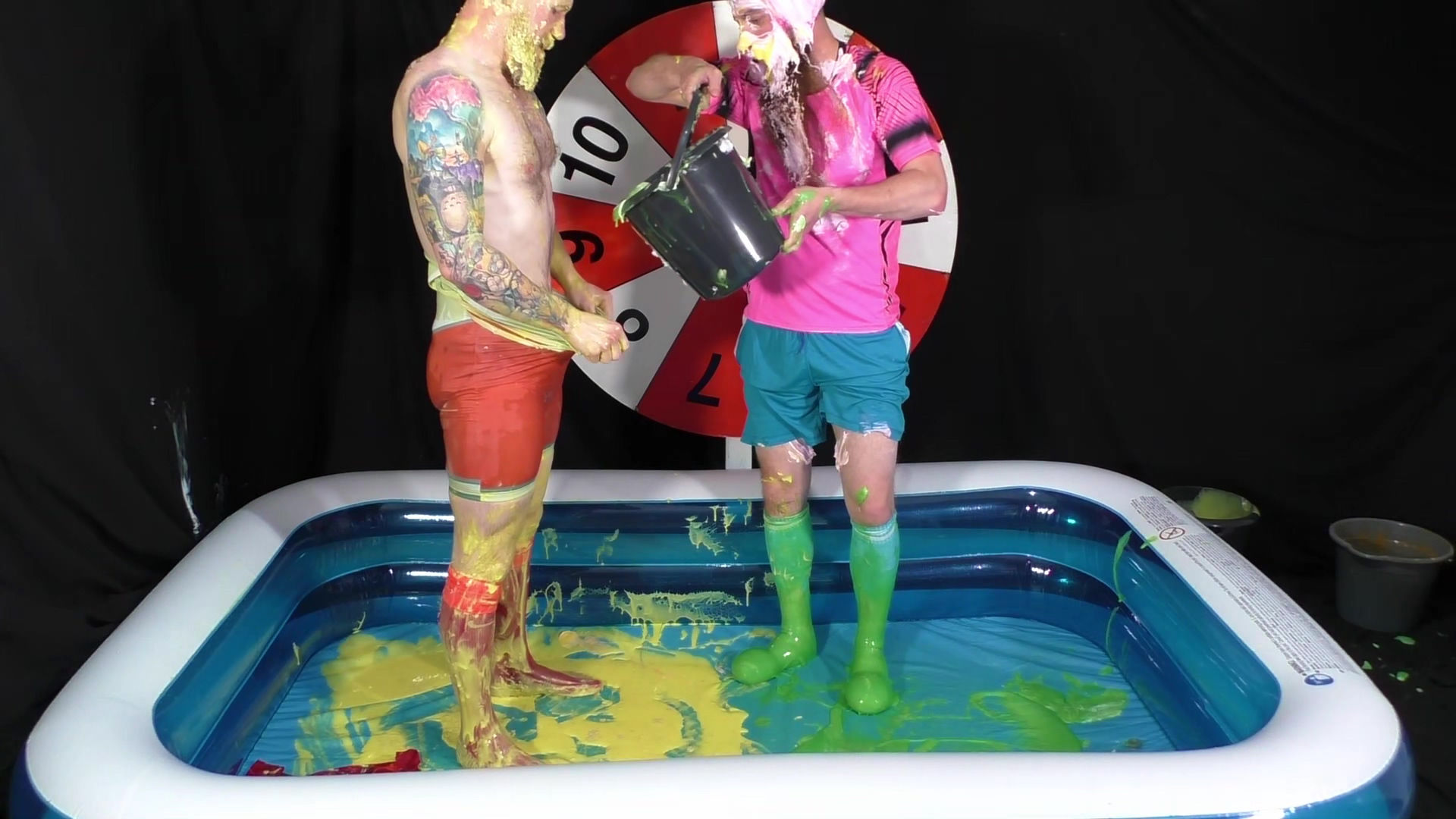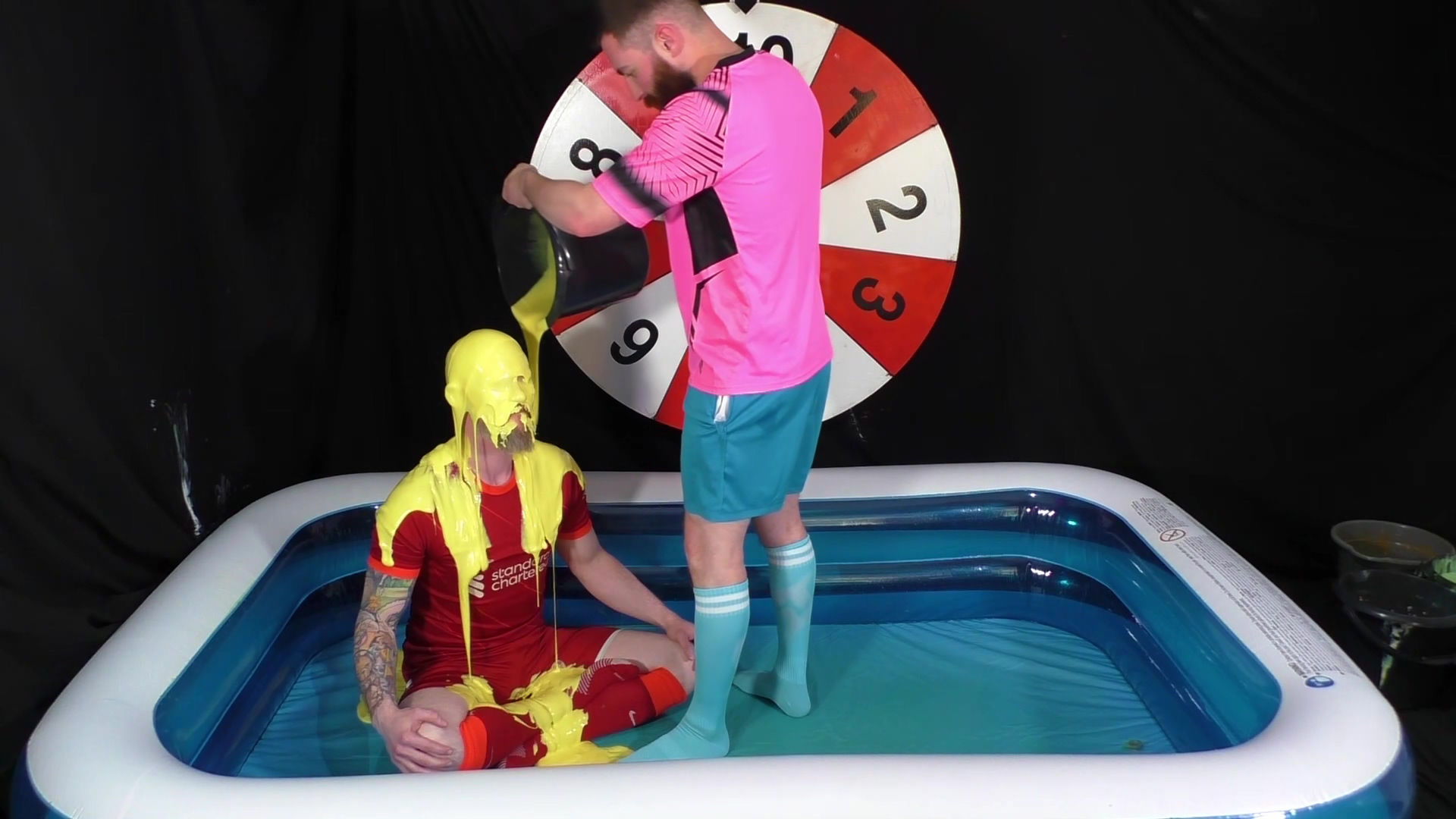 Another two player version of Wheel of WAM. Our players each get 5 spins of the wheel. Each number corresponds to a forfeit. In the red Liverpool kit is Tiggs, with James in the pink shirt and blue shorts and socks. Tiggs spins first landing on a Taken in to Custardy and having thick yellow custard poured over him. James then spins getting pies. Other forfeits include head dunking in to porridge, socks filled with gunge, messy pants, wedgies, pie push-ups and James doing a gunge angel. At the end of game, it becomes a wrestle in Speedos in lots of green gunge.