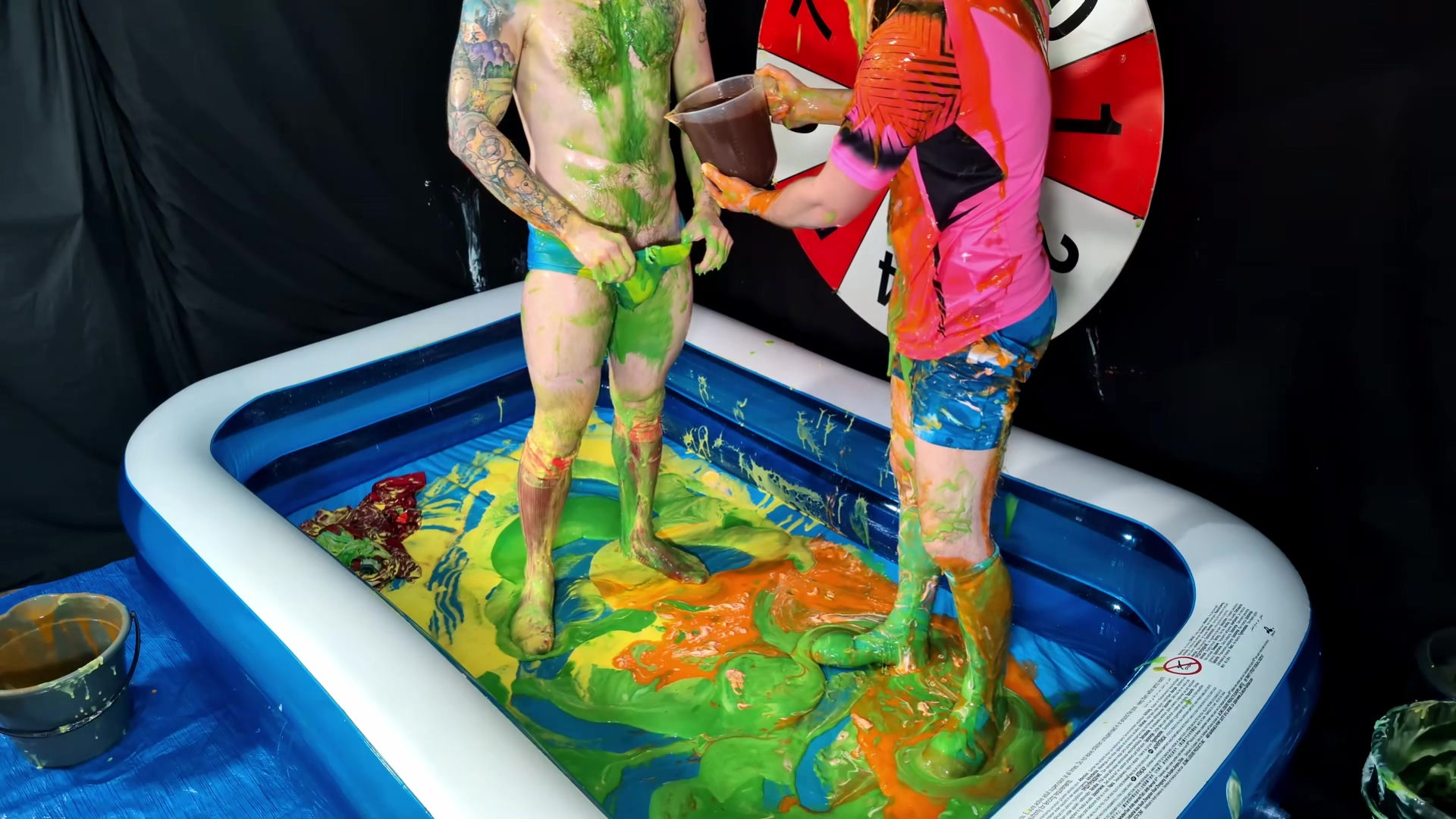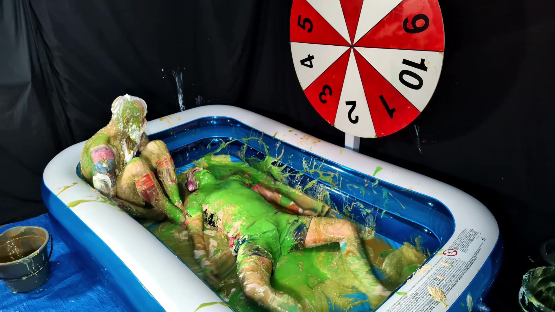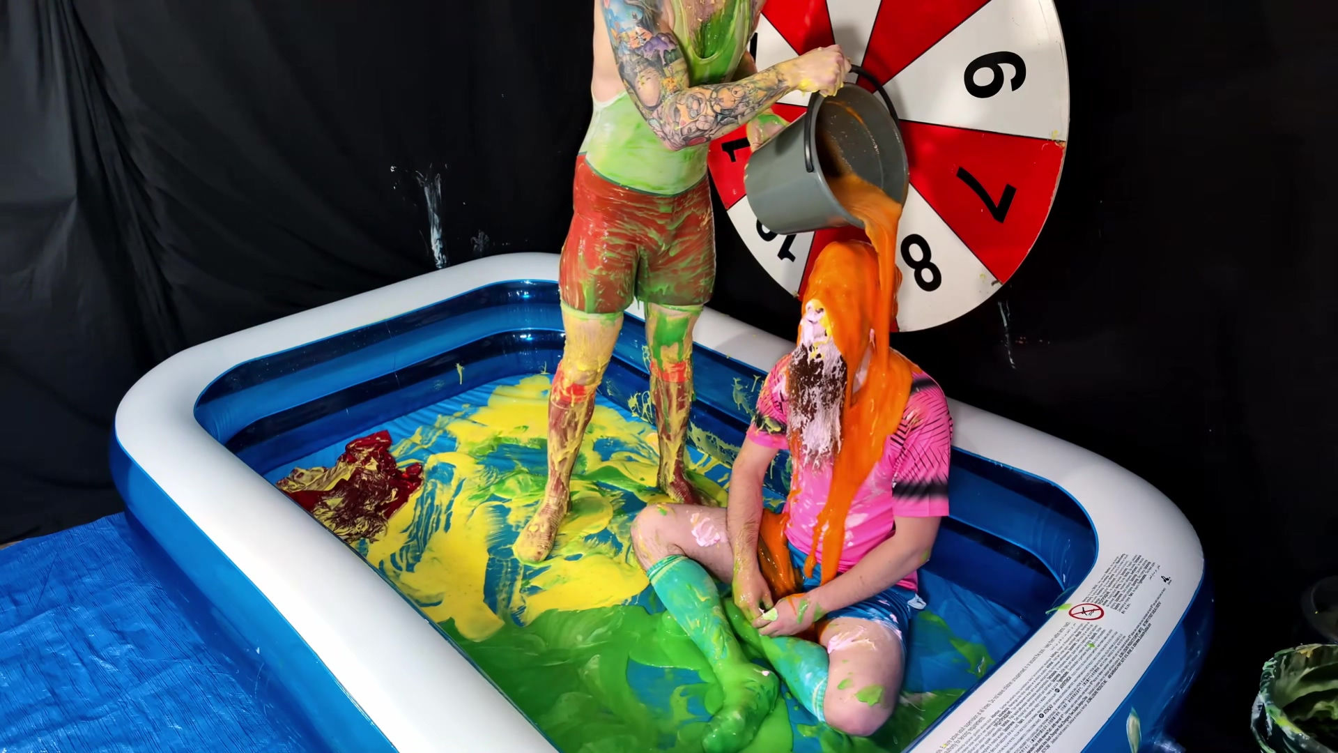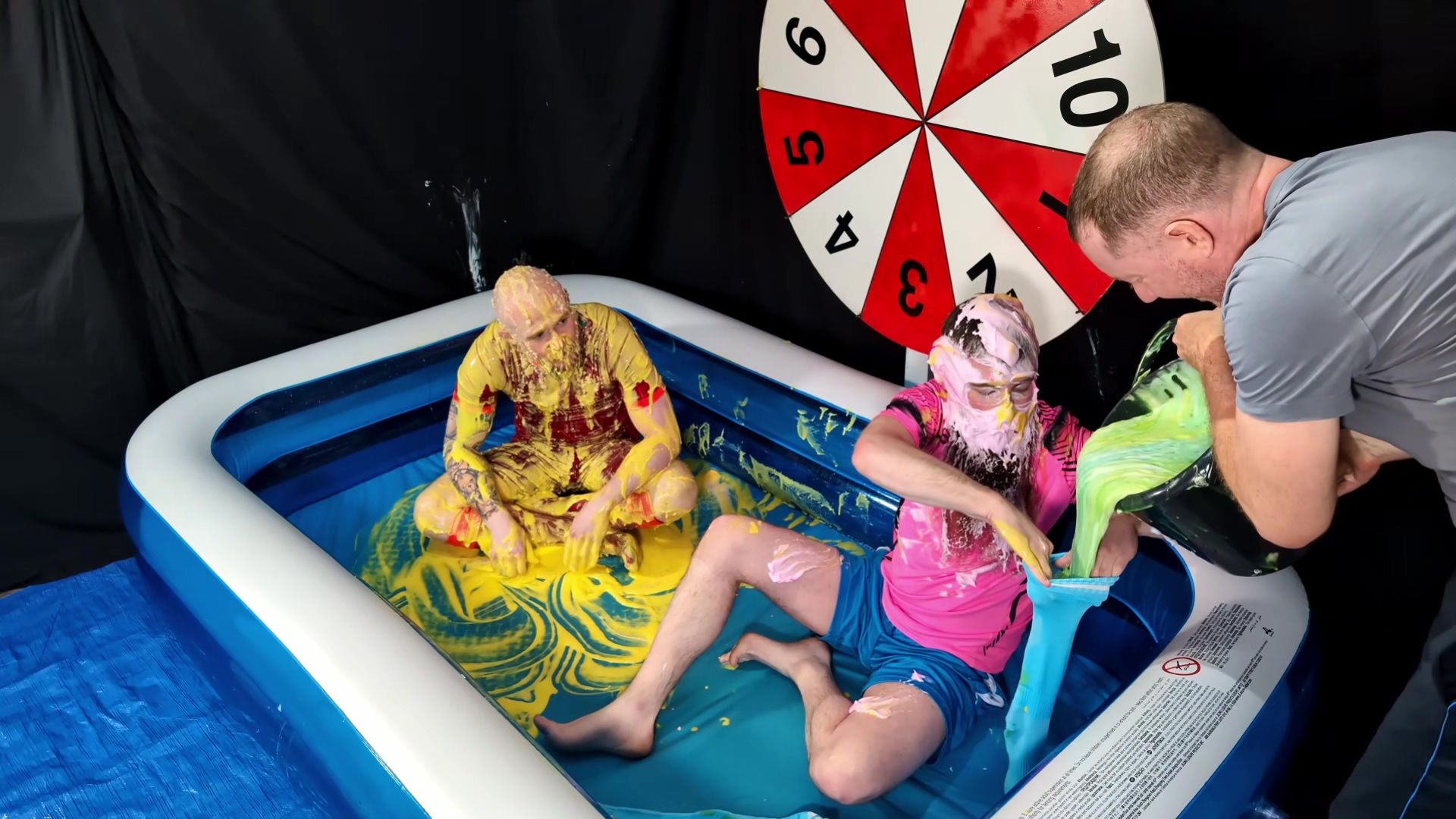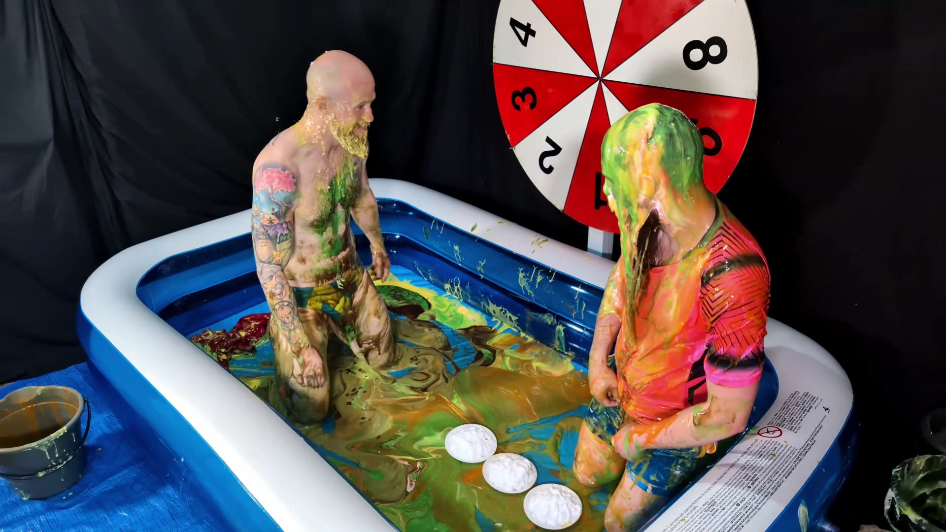 Another two player version of Wheel of WAM. Our players each get 5 spins of the wheel. Each number corresponds to a forfeit. In the red Liverpool kit is Tiggs, with James in the pink shirt and blue shorts and socks. Tiggs spins first landing on a Taken in to Custardy and having thick yellow custard poured over him. James then spins getting pies. Other forfeits include head dunking in to porridge, socks filled with gunge, messy pants, wedgies, pie push-ups and James doing a gunge angel. At the end of game, it becomes a wrestle in Speedos in lots of green gunge.